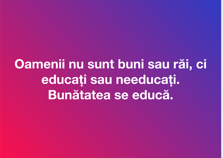 Dar dacă educi bunătatea? Dacă iubești? În primul rând ceea ce ți se întâmplă rău pierde din intensitate. Nu-ți mai țiuesc urechile, nu ți se mai încețoșează vederea după ce ai primit un pumn. Vezi clar înainte. Și vezi că omul care te-a lovit și te-a întors din drum, de fapt te-a ajutat să scapi de un canal deschis. Care te aștepta mai încolo. În care ți-ai fi rupt gâtul. E posibil așa ceva? Zic și eu…Dar poate e posibil…Și în loc să te dai cu capul de pereți că ai primit un pumn, ar trebuie să zâmbești că mai ai gât. E important să ai gât.