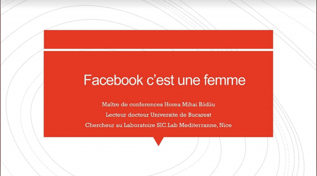 Astăzi am prezentat cercetarea ”Facebook este o femeie” la cea mai importantă Conferință Internațională în Științele Comunicării și Inteligență Artificială in 2021, organizată de Universitatea din Bordeaux, Laboratorul Internațional de Cercetare MICA și UNESCO. Organizator principal: Alain Kiyindou, fondatorul Societății Franceze în Științele Informației și ale Comuncării.