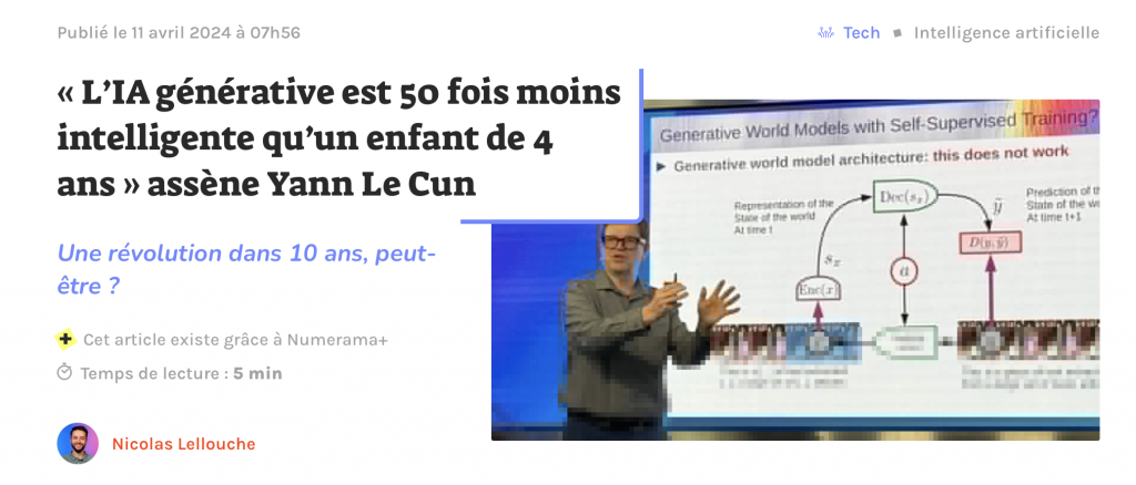 Mais je pense qu’il faut ouvrir un débat sur ses paroles: « L’IA générative est 50 fois moins intelligente qu’un enfant de 4 ans »