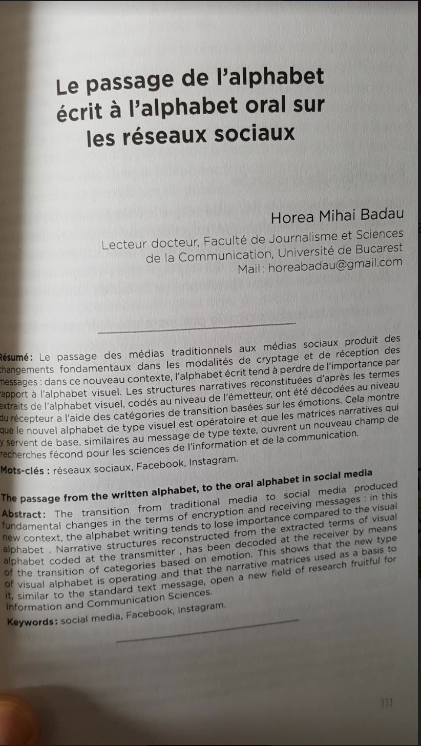Horea Mihai Badau est l’auteur de la première théorie sur les réseaux sociaux qui stipule qu’on va abandonner l’alphabet écrit pour communiquer à l’aide des images, publiée par la SFSIC aux Éditions L’Harmattan (2015) et de deux publications dans des revues qualifiantes en SIC 71: la première Charte éthique des réseaux sociaux publiée dans la Revue française des Sciences de l’information et de la Communication (2018 – https://journals.openedition.org/rfsic/3527?lang=en) et la première recherche examinant l’effet du miroir algorithmique sur les utilisateurs, publiée dans Cahiers du numérique (2019 – https://www.cairn.info/revue-les-cahiers-du-numerique-2019-3-page-211.htm)